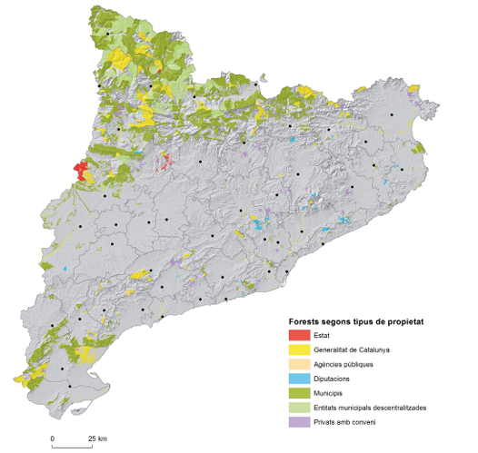 Del més de mig milió d’hectàrees de forests de gestió pública de Catalunya, gairebé 300.000 (un 58 %) tenen gestió municipal i unes 95.000 ha (un 18 %) les gestionen directament les entitats municipals descentralitzades, fet que suma una gestió de proximitat de tres quartes parts de les forests públiques. El tercer ens gestor en volum de superfície és la Generalitat de Catalunya, amb unes 89.000 ha, el 17 % del total. Prop de 17.000 ha (el 3 %) de gestió pública són de propietat privada, però amb conveni de gestió, mentre que el pes d’altres entitats, com ara l’Estat, les diputacions i altres agències públiques, és molt minoritari. Bona part dels boscos públics es concentren en la zona pirinenca, encara que també hi ha extenses masses forestals públiques a les Terres de l’Ebre. Cal tenir present que els boscos de gestió pública només representen un 25 % dels 2 milions d’hectàrees de superfície forestal; el 75 % restant queda sota gestió privada. Font: elaboració pròpia a partir de la base cartogràfica de forests públiques actualitzada a 2021, del Departament d’Acció Climàtica, Alimentació i Agenda Rural.