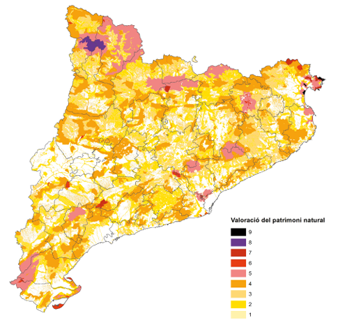 Sobre el sòl no urbanitzable se superposen diferents nivells de protecció natural, que limiten determinats usos i activitats i que afecten bona part d’aquestes àrees amb una intensitat diferent, que s’avalua des d’1 fins a 9, en la qual el 9 correspon a la màxima protecció derivada de la figura de les reserves naturals integrals, seguint la classificació d’espais reflectida en el quadre 7.1. Destaca el reconeixement patrimonial atorgat als Pirineus, particularment a la taca nord-occidental i la part més alpina i propera a la frontera. La línia que segueix aproximadament la serralada prelitoral, des d’Olot fins als ports de Beseit, constitueix l’altre eix patrimonial destacat, amb les fites conegudes de la zona volcànica de la Garrotxa, Montseny, Montserrat, Prades-Montsant i els Ports. Font: Aldomà, I., Mòdol, J.R. i Guerrero, M. (2017). Patrimonis rurals: Reconeixement i perspectives, Fundació del Món Rural i bases cartogràfiques d’espais naturals, principalment procedents del Departament d’Acció Climàtica, Alimentació i Agenda Rural, encara que també d’altres institucions: Forests públiques del Departament d’Acció Climàtica, Alimentació i Agenda Rural, Reserves naturals fluvials de l’ACA i resta d’espais forestals a partir de la cartografia comarcal del SIGPAC del Departament d’Acció Climàtica, Alimentació i Agenda Rural, recollint només els espais d’ús forestal.