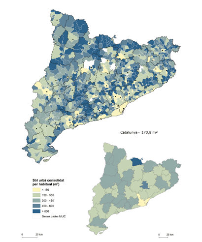 Als municipis amb més habitants la població viu més concentrada i ocupa menys espai, en consonància també amb la competència per l’ús del sòl i uns preus més elevats d’aquest sòl. Per regla general són, doncs, els que compten amb menys superfície urbana per habitant. Per contra, en zones rurals amb escassa població, sobretot en aquelles amb un desenvolupament residencial de segona residència (com és el cas de la Cerdanya i altres zones pirinenques) o en algunes zones de primera residència amb abundància d’urbanitzacions (segona corona metropolitana de Barcelona), el volum de sòl urbanitzat per habitant és molt més elevat. La Coma i la Pedra, i Prats i Sansor, són els municipis catalans amb més quantitat de sòl urbà consolidat per habitant, al voltant de 5.000 m2. Mentre que a les zones de nova urbanització pot contribuir-hi la presència de terrenys urbanitzats per edificar, als nuclis rurals hi trobarem solars i edificacions més amplis a uns preus més moderats, que són els que atreuen habitants de ciutat cap a aquestes àrees. Font: elaboració pròpia a partir del Mapa urbanístic de Catalunya (MUC), del Departament de la Vicepresidència i de Polítiques Digitals i Territori i de les dades padronals de població per municipi i comarca 2020 de l’Idescat. Es considera sòl urbà consolidat aquell que està edificat o presenta les condicions d’urbanització per estar-ho de manera immediata.