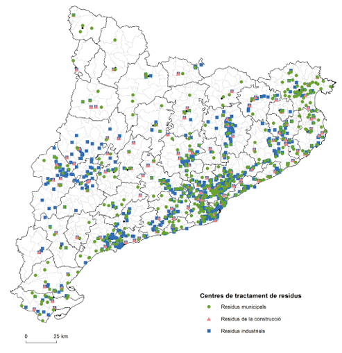 No es pot dir que el tractament de residus recaigui fonamentalment sobre les àrees rurals, tal com mostra la implantació dels diferents centres de tractament, que segueix unes pautes de concentració fonamentalment urbanes. Amb tot, hi ha una escampada important de centres de tractament de residus cap a les àrees rurals, particularment les àrees més planeres de l’interior. Hi destaquen els de residus industrials, molts relacionats amb la indústria alimentària. La proliferació de centres de tractaments de residus a les comarques de l’Empordà i zones pròximes a la Costa Brava es relaciona amb l’elevat increment de població que hi acudeix estacionalment per motius turístics. Font: elaboració pròpia de les bases de l’Agència de Residus de Catalunya a partir de l’Hipermapa.