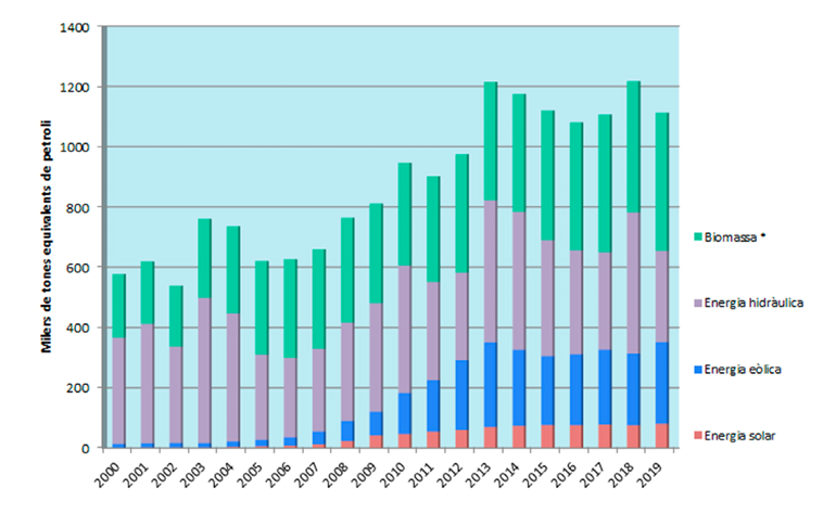 Gràfic 7.6. Producció d’energia primària de fonts renovables segons el seu origen a Catalunya, 2001-2019