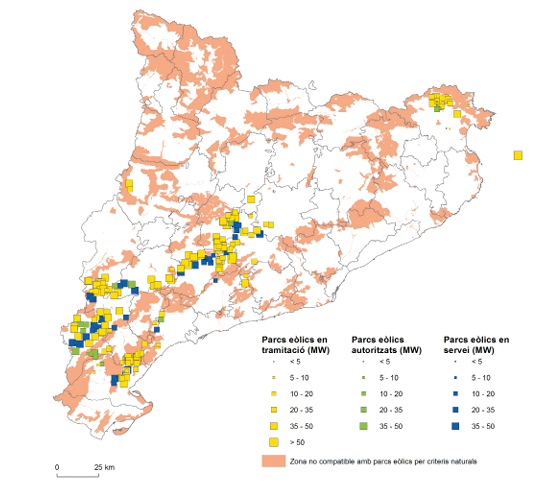 L’energia eòlica ofereix una font molt interessant de producció d’energia renovable, que representa una oportunitat interessant per a les àrees rurals i que ha tingut fins avui en dia un desenvolupament limitat, per bé que les condicions d’implantació a Catalunya no són gaire satisfactòries. Els projectes d’aprofitament de l’energia eòlica sumen una gran quantitat de parcs que s’acumulen sobre les àrees que ja disposen de parcs eòlics i que són les que ofereixen les millors condicions per a la seva explotació. Els projectes afecten en particular tota la línia de carena entre la conca del Segre i el vessant directament mediterrani, a més d’algunes serralades interiors de les Terres de l’Ebre i una ubicació puntual a l’Alt Empordà. El debat territorial de pros i contres existeix, donat que la generació es concentra en territoris rurals que es queden amb un percentatge ridícul dels beneficis, mentre que el consum se centra en zones urbanes. Font: Capes d’informació sobre parcs eòlics en servei i en projecte del Departament d’Acció Climàtica, Alimentació i Agenda Rural descarregades de l’Hipermapa. (https://sig.gencat.cat/visors/hipermapa.html)
