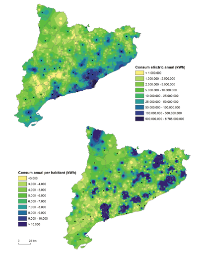 El mapa municipal del consum d’electricitat ens redibuixa l’estructura urbana del país i en destaca les principals aglomeracions i eixos, reforçats, si cal, pels consums industrials, que s’afegeixen als consums domèstics, els quals comprenen naturalment els de les segones residències i/o la població estacional. A banda de trobar els consums més elevats a les grans concentracions urbanes, als municipis rurals hi ha les zones de menys consum, que són també les que concentren més pressió per al desenvolupament de projectes d’energies renovables. El consum d’energia elèctrica per habitant (població resident, s’entén) ens remet al biaix provocat per la presència de segones residències i població estacional, i sobretot per la presència de consumidors industrials. Els punts i les àrees de més consum destacarien, doncs, en els punts de més concentració productiva. Font: Consum d’energia elèctrica per municipis i sectors de Catalunya, dades 2018 i 2019, de l’Institut Català d’Energia, Departament d’Acció Climàtica, Alimentació i Agenda Rural.