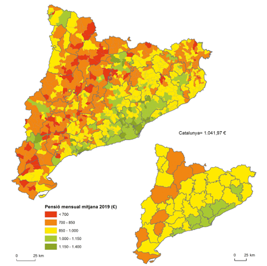 Es presenta una diferenciació clara de les pensions mitjanes mensuals entre la part oriental i l’occidental de Catalunya, la darrera corresponent a les comarques de perfil més rural del país. Hi tindrien a veure tant la major presència d’actius en el sector agrari, habitualment autònoms amb pensions reduïdes, com diferències també en el nivell dels salaris, que són la base de les cotitzacions. Les pensions contributives són habitualment de durada indefinida i s’atorguen d’acord amb les cotitzacions i/o una relació jurídica prèvia amb la Seguretat Social. Font: estadística de Pensions contributives de la Seguretat Social extreta d’Idescat.