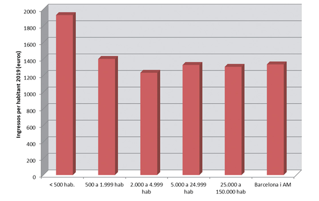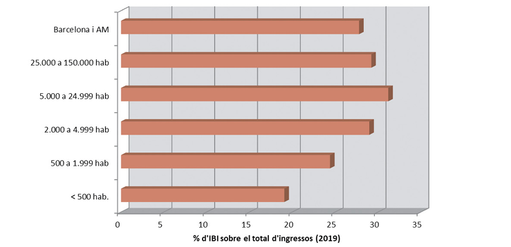Els ajuntaments petits aconsegueixen uns ingressos per càpita significativament superiors als de la resta, però aquests no provenen precisament dels ingressos que provenen dels impostos recaptats directament pels ajuntaments (el més important de tots és l’IBI), sinó de les transferències provinents de les administracions superiors. Quant a l’IBI, com a exemple, s’aprecia una certa homogeneïtat municipal en el pes per habitant que suposa aquest impost directe, però la disponibilitat d’ingressos municipals per a aquest concepte sí que presenta un fort gradient segons la magnitud del municipi. La quota de l’IBI dependrà de si hi ha hagut revisió o no de la ponència cadastral de valors i també de l’any de l’entrada en vigor de la nova ponència. Font: elaboració pròpia a partir de dades extretes d’Idescat procedents de la Direcció General del Cadastre del Ministeri d’Hisenda i Administracions Públiques i dades de liquidacions de pressupostos del mateix ministeri.