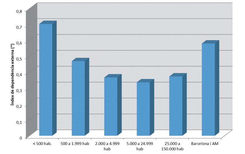 El gràfic remarca de manera fefaent l’elevat grau de dependència superior dels municipis petits respecte a les transferències procedents d’altres administracions per a la confecció del seu pressupost, per bé que els municipis metropolitans disposen d’unes transferències específiques per part de l’administració central que fan pujar força l’índex. Font: elaboració pròpia a partir de les dades de la Liquidación de los Presupuestos de las Entidades locales 2019, del Ministeri d’Hisenda. (*) L’índex de dependència és un indicador calculat a partir de dividir el volum mitjà de transferències corrents del període 2015 a 2019 (capítol 4 d’ingressos) pel conjunt d’ingressos propis dels ajuntaments (capítols 1 a 3), que inclouen impostos directes, indirectes i les taxes públiques, tot plegat expressat en tant per 1.