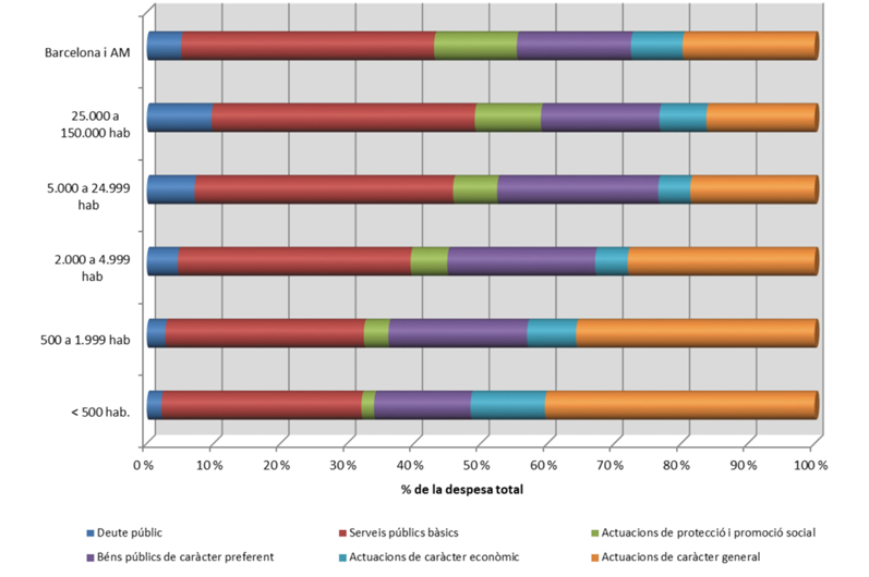 A mesura que els municipis són més petits, es fan més importants les despeses de funcionament de les pròpies administracions, les de caràcter general, així com les despeses lligades al manteniment de les infraestructures locals, com ara els camins. El pressupost queda més reduït, en canvi, per invertir en serveis públics bàsics i protecció social. Mentrestant, el servei de deute es manté a ratlla, en bona part gràcies a les menors facilitats de contractar préstecs. Font: elaboració pròpia a partir de les dades de la Liquidación de los Presupuestos de las Entidades locales 2019, del Ministeri d’Hisenda, segons la classificació per programes de despesa pròpia del mateix ministeri.