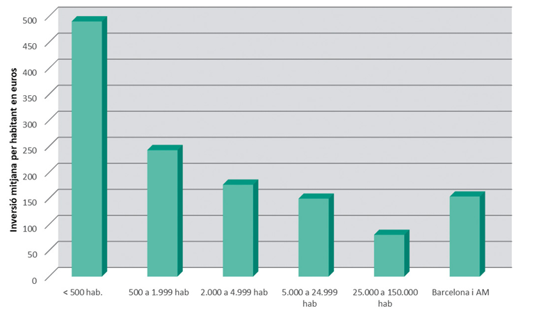 Tot i el pes relatiu superior de les despeses corrents, els ajuntaments petits aconsegueixen un capítol d’inversions prou nodrit en relació amb la població que representen, i només per això cal remarcar l’interès de les actuacions municipals per compensar els dèficits locals. Aquestes inversions, per altra part, responen més a la consecució d’ajuts externs per a la realització d’obres que no pas a les mateixes disponibilitats financeres. Font: elaboració pròpia a partir de les dades de la Liquidación de los Presupuestos de las Entidades locales 2015 i 2019, del Ministeri d’Hisenda, segons la classificació per programes de despesa pròpia del mateix ministeri.