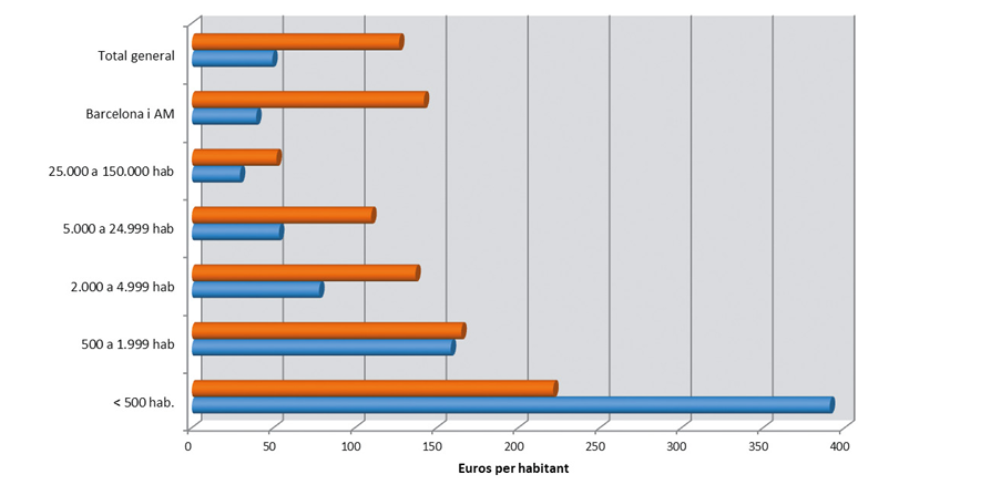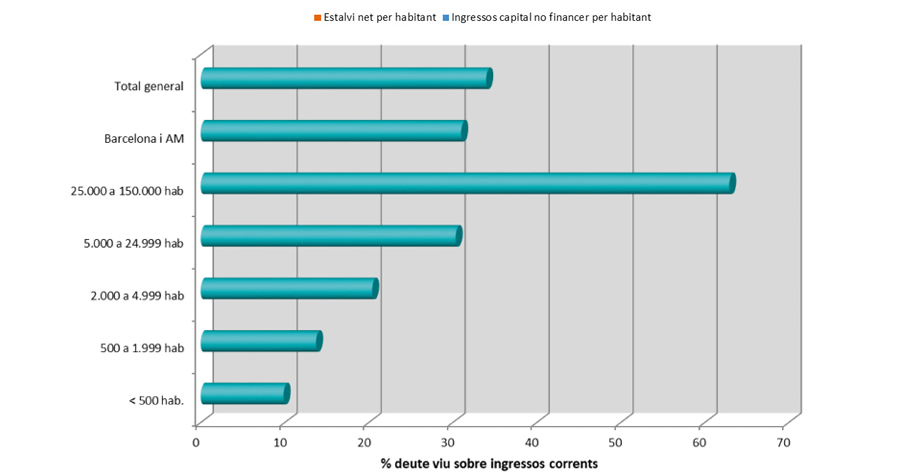 Com més petit és el municipi, major és l’estalvi net i els ingressos de capital no financer per habitant, i menor la ràtio d’endeutament. D’alguna manera, la seva dimensió econòmica els obliga a la prudència financera, un fet que en els darrers anys ha vingut també molt condicionat per les lleis estatals d’ajustament de la despesa pública, en particular la Llei 27/2013, de racionalització i sostenibilitat de l’Administració local, que pretenia una reforma dràstica del mapa municipal que no s’arribà a aplicar, però que sí que ha limitat radicalment la capacitat d’endeutament i despesa de les administracions locals. L’escassa dimensió dels municipis i el pes de les despeses bàsiques no semblen afectar els municipis petits, que són els que més adapten els seus recursos (sobretot els procedents de transferències externes) a la seva despesa. Font: elaboració pròpia a partir de les dades de la Liquidación de los Presupuestos de las Entidades locales 2019, del Ministeri d’Hisenda. Els ingressos corrents són els ingressos totals (capítol 1 a 5) menys contribucions especials, quotes d’urbanització i ingressos extraordinaris. L’estalvi net comprèn els ingressos totals (capítols 1 a 5) menys la despesa dels capítols 1, 2, 4, 5 i 12. Els ingressos de capital no financer són ingressos patrimonials, corresponent a rendiments de finques rústiques i urbanes, bàsicament.
