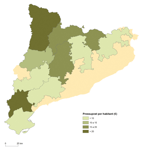 Els respectius Grups d’Acció Local que gestionen els programes Leader presenten un pressupost general sense grans variacions entre uns àmbits territorials d’aplicació i els altres. Les diferències de les despeses previstes per habitant de cada àmbit resulten prou més significatives. En la seva valoració cal tenir en compte, en qualsevol cas, que el perfil de cadascun dels territoris és molt diferent, particularment quant a les seves connotacions rurals, en el sentit de presència de petits nuclis i masies, la densitat del poblament o la base econòmica centrada en l’agricultura o el turisme rural. Es justifica en aquest sentit la major incidència dels ajuts del programa Leader als extrems nord-occidental i sud-occidental del país. Font: elaboració pròpia a partir de la Resolució ACC/3136/2021, de 12 d’octubre, per la qual es convoquen els ajuts destinats a l’aplicació del desenvolupament local participatiu Leader.