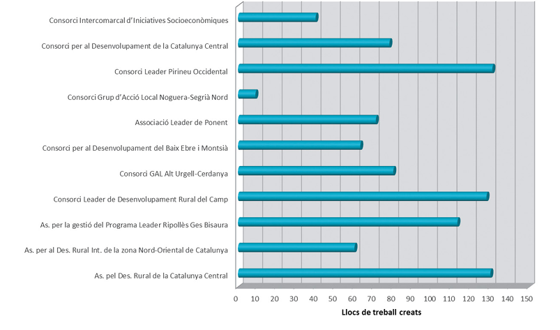 En relació amb els pressupostos que es presenten en el mapa anterior, i la seva plasmació final en els objectius buscats, cal esmentar aquí l’impacte del programa en la creació d’ocupació. En el període analitzat es van crear més de 900 llocs de treball, que si bé en nombres absoluts potser no sembla una gran xifra, s’ha de contextualitzar en el caràcter rural de bona part dels municipis d’aquests àmbits, per la qual cosa suposa un suport remarcable a la generació d’ocupació en aquests àmbits. Font: elaboració pròpia a partir de les dades de tancament de les convocatòries 2016.01, 2016.02, 2017 i 2018. (*) S’hi inclouen les dades de 2019, que es troben a mig certificar.