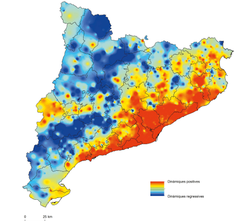 En el mapa dels darrers anys de creixement econòmic hi apareixen clarament dues Catalunyes: l’oriental, més poblada i dinàmica, i la rural, més despoblada i de perfil recessiu. En una dinàmica de base industrial que es remunta al segle XIX s’imposaren unes dinàmiques de creixement econòmic i demogràfic que generen unes sinergies poderoses, que experimenten lleugeres modificacions amb la transformació terciària iniciada en els anys vuitanta. La població i l’activitat es concentren a la metròpoli de Barcelona i entorns urbans propers que augmenten abast i influència, mentre que les zones interiors desenvolupen alguns centres dinàmics i les poblacions petites segueixen uns processos de buidat de ritme i profunditat desiguals. En els darrers deu anys hi ha encara una Catalunya urbana en creixement, mentre al país interior es consolida l’àrea de creixement urbà i industrial de Ponent, així com les contrades de desenvolupament turístic de muntanya al voltant de la Vall d’Aran, l’Alta Ribagorça i la Cerdanya. Entremig, els municipis del sud, la Terra Alta, la Ribera d’Ebre, el Priorat, les Garrigues, la Conca de Barberà; pel nord, la Noguera, el Solsonès, els dos Pallars, l’Alta Ribagorça, l’Alt Urgell i part de la Cerdanya, el Berguedà i el Ripollès es queden més aviat enrere, amb una situació més favorable als seus centres comarcals. Font: elaboració pròpia. A partir d’un índex que sintetitza les variables a escala municipal de: creixement demogràfic 2013-2019, saldo migratori 2013-2019, potencial de creixement (2019) i creixement dels llocs treball 20132019, a les quals s’han afegit uns indicadors de magnitud, el nombre d’habitants (2019) i la població total de <15 anys (2019).