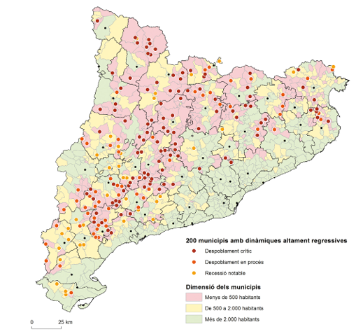 De l’índex establert en el mapa 9.2 se’n pot deduir una classificació dels municipis segons el seu caràcter més o menys recessiu, que és el que es representa en el mapa 9.3. Entre els 200 municipis més mal situats d’acord amb l’índex, 163 tenen menys de 500 habitants, 32 tenen entre 500 i 1.000 habitants i 4 tenen entre 1.000 i 2.000 habitants. El municipi amb més nombre d’habitants és Flix (3.408 habitants), víctima de la crisi industrial recent. De fet, no trobem un municipi de més de 500 habitants fins al lloc 90 del rànquing municipal esmentat. Es fa evident l’impacte de les tendències recessives en municipis petits, amb una estructura de població envellida i una activitat econòmica escassa i poc diversificada. Es tracta de municipis aliens al desenvolupament industrial i amb un nivell de serveis clarament insuficient, directament relacionat amb la dimensió reduïda dels nuclis i l’allunyament dels centres d’activitat importants. L’activitat agrària, principal ocupadora laboral en altres temps, s’ha mecanitzat, sense alternatives laborals que hagin pogut substituir-la com a creadores de llocs de treball. Entre aquests municipis podríem situar per davall dels 200 habitants aquells en què el fantasma del despoblament es fa més evident (en color grana). Font: elaboració pròpia a partir de dades de dinàmica demogràfica i econòmica utilitzats en el mapa 9.2 anterior.