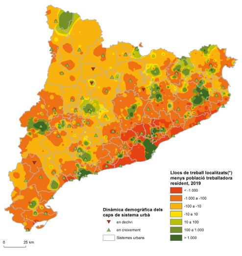 Des del primer Atles de la nova ruralitat (FMR, 2009) s’ha considerat que l’evolució dels municipis i les àrees rurals en general va lligada en primera instància a l’estructura urbana del mateix territori i a la dinàmica econòmica i social estirada per les respectives ciutats o centralitats urbanes. D’una banda, es poden abordar les dinàmiques del despoblament que experimenten els petits nuclis i municipis, com es posa de relleu en els mapes 9.2 i 9.3, a partir de propostes específiques per facilitar processos d’acollida i regeneració d’aquests petits indrets. Però no es pot perdre de vista que en un context de mobilitat com l’actual és la dinàmica de tot l’entorn la que marca l’evolució dels petits, i aquesta dinàmica reposa fonamentalment sobre les àrees industrials i els petits i grans establiments de serveis públics i privats que s’ubiquen a les capitals i al seu entorn immediat. La proximitat dels petits nuclis i masies a aquests centres resulta fonamental per a la dinàmica del conjunt. I si els casos de decreixement i els problemes sociodemogràfics es concentren en àrees del Pallars i Prepirineu i de les terres interiors del sud és precisament perquè no tenen uns centres urbans prou robustos i dinàmics, i tampoc hi ha un model de creixement difús com el de les contrades turístiques de l’Aran i la Cerdanya. La radiografia dels municipis d’atracció i d’expulsió laboral dona compte d’aquestes dinàmiques en mostrar els principals centres atractors del país i les àrees de captació d’ocupació generades en el seu entorn. Destaquen a l’entorn metropolità de Barcelona, però són també remarcables a l’entorn de Girona i dels centres nord-orientals de Figueres, Olot, Ripoll, Vic, Manresa i Igualada, a més de Tarragona, Valls-Montblanc i Tortosa-Amposta. A l’interior hi destaca Lleida i el seu entorn, que perllonga la influència fins a Cervera, al nord de la qual apareix un epicentre de potència laboral autònoma com Guissona. Noti’s que la balança laboral favorable que reflecteix el mapa no es localitza sovint en la mateixa ciutat capital, sinó en un terme veí on s’ha establert una indústria o àrea comercial o de serveis, fet força freqüent a les comarques gironines. En entorns rurals relativament poc densos, aquestes circumstàncies provoquen singularitats com la forta atracció del Naut Aran, que concentra els atractius turístics, sobre Vielha, el Naut Aran i fins i tot més enllà. Una altra singularitat és la de la Seu d’Urgell i l’Alt Urgell, que necessiten la comparació (sense dades disponibles) amb la veïna Andorra per entendre la seva situació de dependència laboral i econòmica en últim terme. Entre les Garrigues i la Terra Alta s’assisteix, per altra part, a la manca de centres prou destacats de referència, una circumstància que es repeteix a la franja prepirinenca entre Tremp i Berga. Aquesta, amb tot, és una reflexió que se situa a l’entorn dels mercats de treball relativament de proximitat, que en certa manera queden recolzats pel mapa de l’atracció-expulsió, però la mobilitat es realitza també sobre escales supracomarcals i el treball a domicili ha disparat el divorci entre lloc de treball i lloc de residència. Ara, pràcticament tota la Catalunya rural pot permetre’s tenir una balança de treball negativa perquè els grans centres metropolitans o regionals de l’ocupació n’hi ofereixen l’oportunitat. Font: elaboració pròpia a partir dels Afiliats a la Seguretat Social, Idescat i INE. (*) Dades de llocs de treball localitzats corresponents a la mitjana de treballadors del Règim General i del Règim d’Autònoms de 4 trimestres (31 desembre de 2018 a 30 de setembre de 2019), del Departament d’Empresa i Treball. Dades de població treballadora segons residència padronal extretes d’Idescat per als mateixos 4 trimestres. Es reprodueixen els límits dels sistemes urbans utilitzats en els plans territorials parcials de la Generalitat de Catalunya com a aproximació a l’àrea dels mercats de treball.